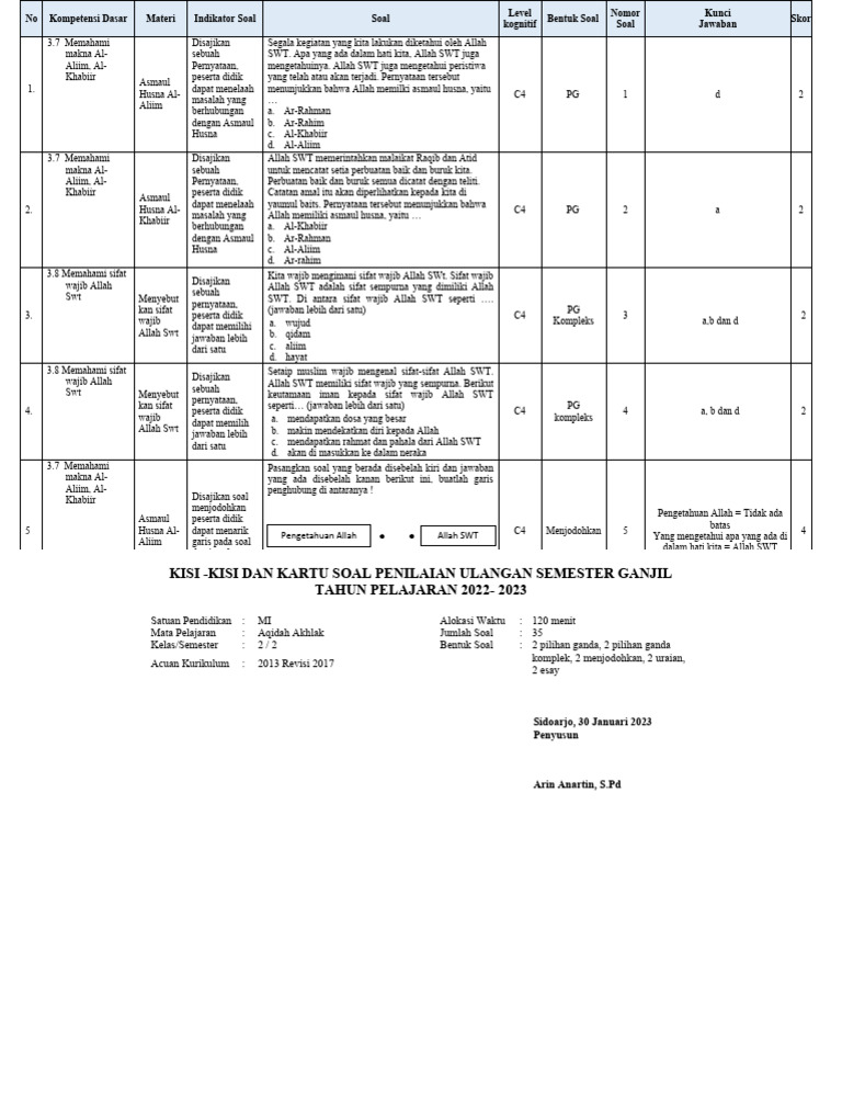 Aqidah, sebagai pondasi keimanan seseorang, memiliki peranan krusial dalam membentuk karakter dan pandangan hidup seorang Muslim. Sejak dini, pemahaman yang benar mengenai prinsip-prinsip akidah perlu ditanamkan dan diperkuat. Dalam konteks pendidikan formal, mata pelajaran Aqidah Akhlak di kelas 4 Madrasah Ibtidaiyah (MI) berdasarkan Kurikulum 2013 dirancang untuk memberikan fondasi yang kokoh bagi siswa. Agar proses pembelajaran dan evaluasi berjalan efektif, pemahaman mendalam mengenai kisi-kisi soal menjadi sangat penting.
