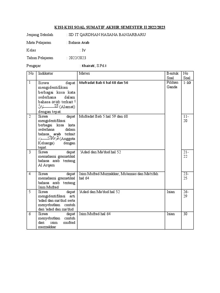 Artikel ini akan mengupas tuntas mengenai kisi-kisi soal Bahasa Arab kelas 4 SD. Kita akan membahas mengapa kisi-kisi itu penting, komponen-komponen utamanya, serta bagaimana cara mengembangkan kisi-kisi yang efektif dan relevan dengan kurikulum. Dengan pemahaman yang mendalam, guru dapat menyusun soal yang mengukur kemampuan siswa secara akurat, dan orang tua pun dapat memahami apa yang diharapkan dari putra-putrinya di kelas Bahasa Arab.