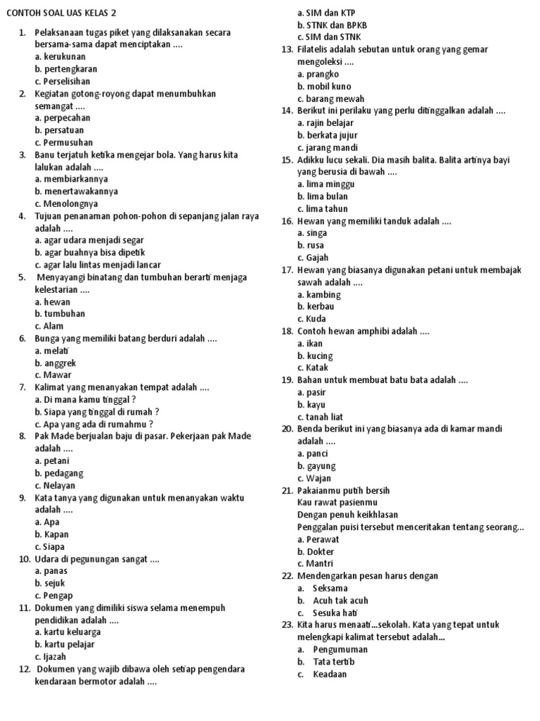 Artikel ini akan mengupas tuntas seluk-beluk pembuatan soal UAS untuk siswa kelas 2 SD. Kita akan membahas mulai dari perencanaan, prinsip-prinsip penyusunan, jenis-jenis soal yang relevan, hingga tips praktis agar soal yang dihasilkan efektif, adil, dan sesuai dengan karakteristik anak usia dini. Dengan panduan ini, diharapkan para pendidik dapat menyusun soal UAS yang tidak hanya menguji pengetahuan, tetapi juga mendorong semangat belajar dan pemahaman mendalam pada siswa kelas 2 SD.